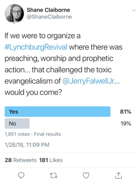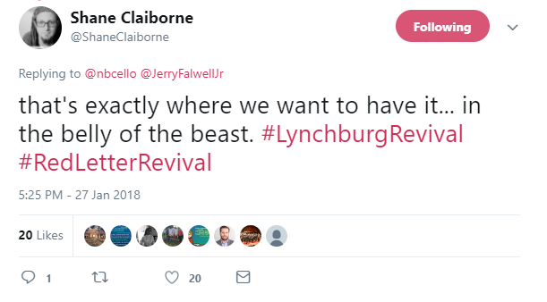 Citing the safety of students from what was aimed as a prayer vigil seems absurd. Falwell has been on Claiborne’s radar for some time and probably didn’t want a potentially embarrassing confrontation to occur on his campus aka his own backyard. And Claiborne can confess brotherly love all he wants, but come on…these tweets don’t seem to express those feelings.